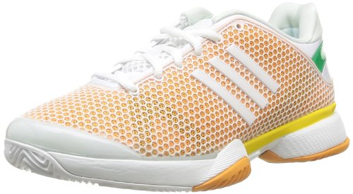 The Stella McCartney collection for adidas combine modern style and fashion with function and high performance. Part of this collection, the adidas Stella McCartney Barricade is a lightweight, high-performing tennis trainer with an advanced construction. It is suitable for playing on multiple courts, like clay courts and hardcourts. This trainer is miCoach compatible so you can track all aspects of your performance. Features a lightweight breathable modern mesh upper for comfort and ventilation, with a grid like synthetic overlay, and synthetic panels on the toe and heel for support and durability. Also features a shaped EVA core for a comfortable and snug fit, and a moulded EVA insole for anatomical comfort. AdiPRENE+ insert in the forefoot maintains propulsion and efficiency whilst adiPRENE under the heel ensures superior cushioning at impact. The TORSION SYSTEM allows for midfoot integrity, ensuring independent movement of the rear and forefoot while maintaining stability. The padded collar and breathable mesh padded tongue provide comfort. The ADIWEAR 6 herringbone patttern rubber outsole offers the ultimate in high-wear durability and delivers excellent traction. Other details include adidas and Stella McCartney branding on the tongue and on the heel.